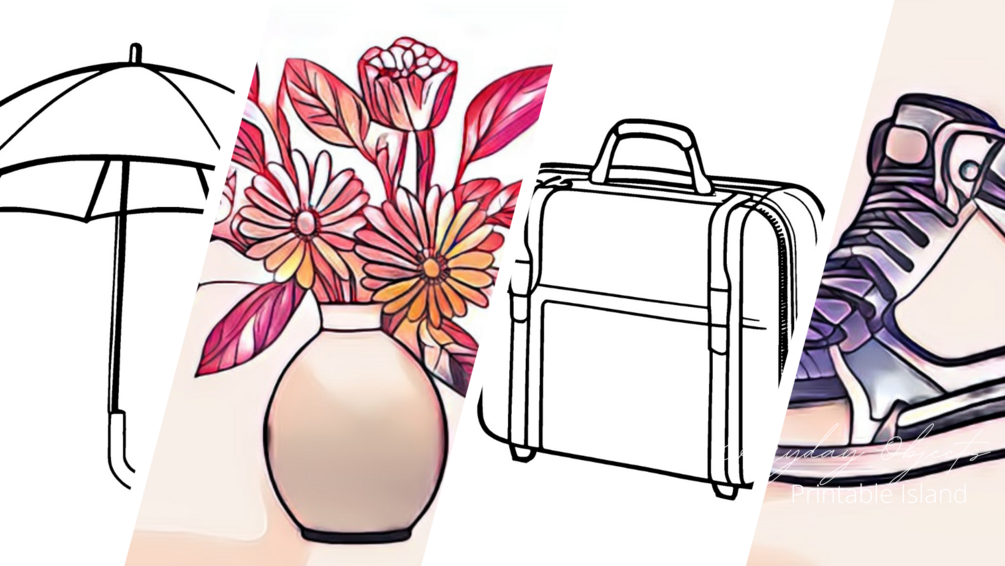 Bring creativity and educational fun to your little ones with this delightful assortment of printable coloring pages featuring familiar everyday objects. Let their imaginations soar as they color in objects such as a charming flower vase, a trendy cap, a travel-ready suitcase, a cozy mug, and many more! Each coloring page is thoughtfully crafted to captivate young minds and encourage artistic expression.